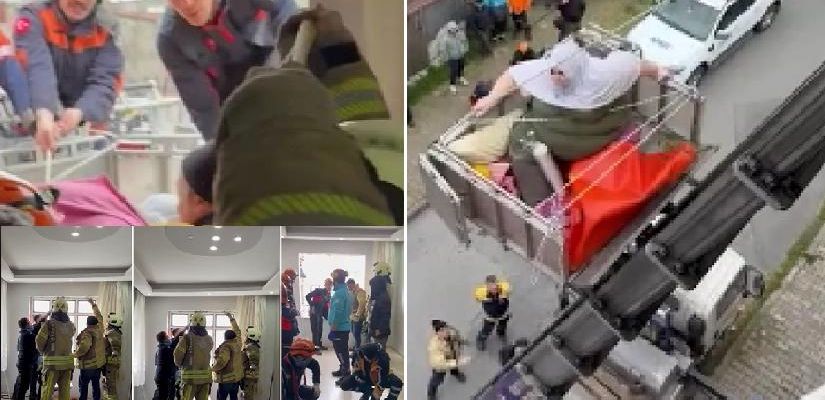 İstanbul’da 240 kiloluk obezite hastası, evinin yedinci katıncan vinçle indirilerek hastaneye götürüldü.
