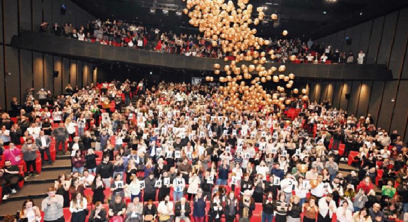 “Aydınlıkevler” oyununun bitiminde salona balonlar yağdı ve gece görsel olarak da unutulmaz bir ana dönüştü.