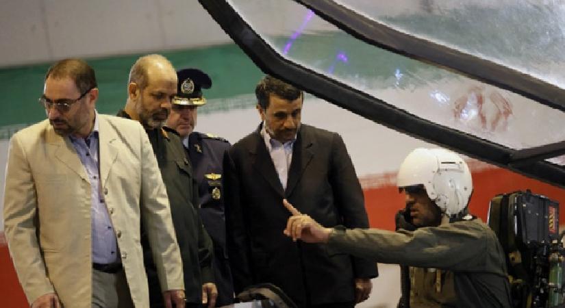 2013 yılında çekilen bu karede, periyodun İran Cumhurbaşkanı Mahmud Ahmedinejad, İran’ın o periyot için en yeni savaş uçağı olan ve yetkililerin radar tespitinden kaçabildiğini tez ettiği Kahhir-313’ün tanıtım merasiminde bir pilotu dinliyor. Ahmed Vahidi de Ahmedinejad’a eşlik edenler ortasında yer alıyor. Fotoğraf: AP