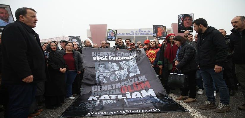 Aralarında şirket yetkililerinin de bulunduğu sekizi tutuklu, ikisi firari 16 sanık hakkında açılan davanın ilk duruşmasının görüleceği Kocaeli Ceza İnfaz Kurumları Kampüsü’ne gelen aileler ile Dilovası İşçi Katliamı Aileleri adlı katılımcılar, “Herkes gördü kimse dokunmadı, Denetimsizlik ölüm, katliam.” yazılı pankart taşıdı.