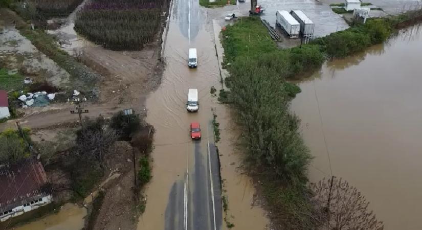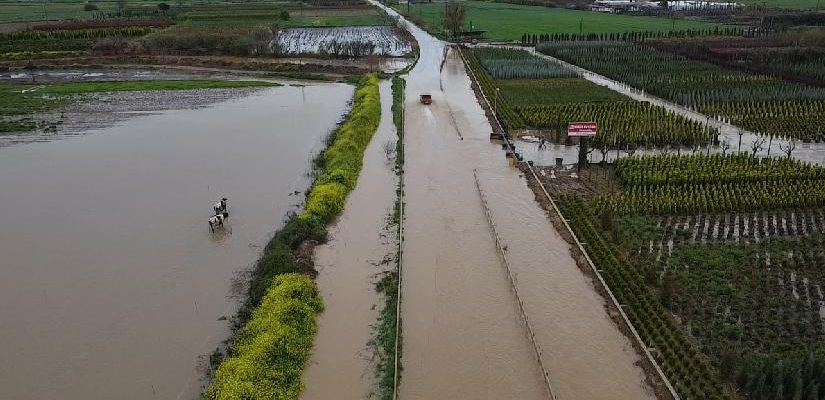 iddetli yağış nedeniyle Ödemiş-Tire kara yolunun Balabanlı Mahallesi yakınlarında su baskınları yaşandı, tarım arazileri ve seralar su altında kaldı.