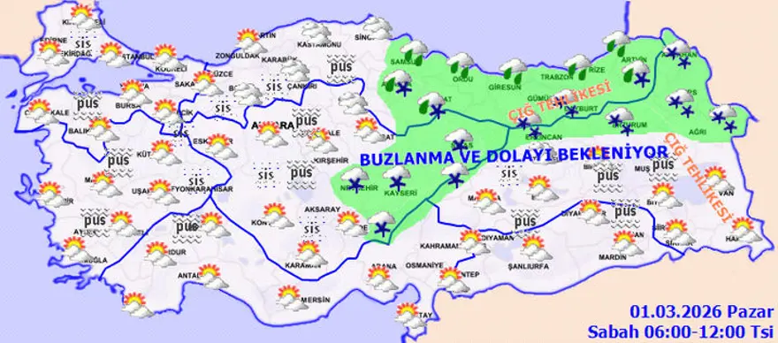 Sabah ve gece saatlerinde Marmara ile iç ve doğu bölgelerde buzlanma ve don ile birlikte sis ve pus olayı bekleniyor.