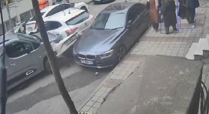 Görüntülerde, hafif ticari aracın otomobile ve park halindeki bir araca daha çarptığı görülüyor. Daha sonra hafif ticari araçtaki gençlerin kaçtığı ve otomobil sürücüsünün kovaladığı anlar yer aldı. Öte yandan tam kaza sırasında kaldırımda olan insanların da kazadan kıl payı kurtulduğu görülüyor.