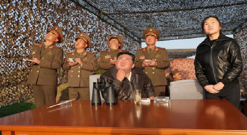 Kuzey Kore hükümeti tarafından 19 Nisan’da yayımlanan fotoğrafta, Kuzey Kore lideri Kim Jong-un ve kızı Kim Ju Ae, balistik füze testlerini izliyor. Fotoğraf: AP.